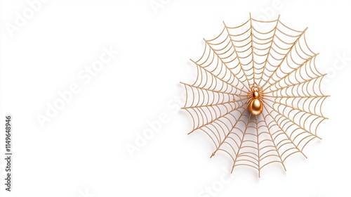 © Thanaphoom, Fototapeta premium A beautifully crafted spider web with a golden spider at its center, set against a minimalist white background.