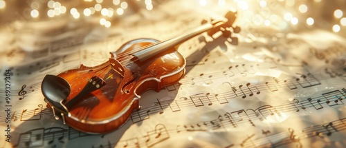 Fototapeta premium A beautifully crafted violin resting on sheet music, capturing the essence of music and artistry with a warm, glowing background.