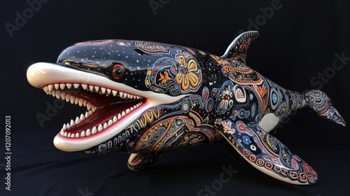 © Marsor, Fototapeta premium A beautifully crafted whale sculpture adorned with intricate floral designs.