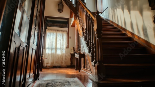 © Pannee, Obraz premium A beautifully crafted wooden staircase with an elegant design.