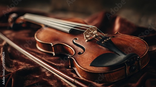 © Sami, Fototapeta premium A beautifully crafted wooden violin resting on a rich, textured fabric, highlighting its elegant curves and intricate details.