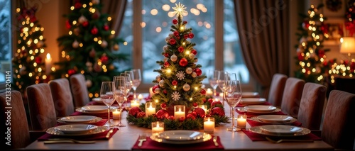 © SwathiFX, Naklejka premium A beautifully decorated Christmas tree stands tall on a festive table, surrounded by warm candles and elegant plates