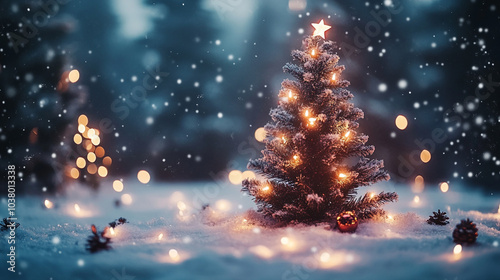 Naklejka premium A beautifully decorated Christmas tree with lights in a snowy landscape...