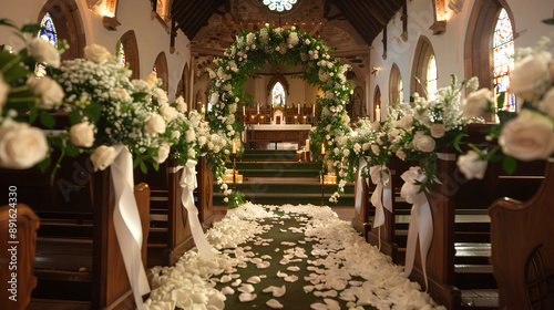 © Thunder, Obraz premium A beautifully decorated church with white flowers and greenery along the aisle, creating an elegant setting for a wedding ceremony.