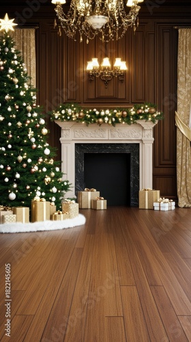 Naklejka premium A beautifully decorated room features a Christmas tree adorned with white lights, gifts on the floor, and a glowing fireplace surrounded by wooden walls creating a festive atmosphere