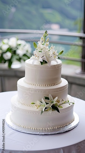 © lililia, Fototapeta premium A beautifully decorated three-tiered wedding cake adorned with pearls and a floral accent, set outdoors in a serene garden