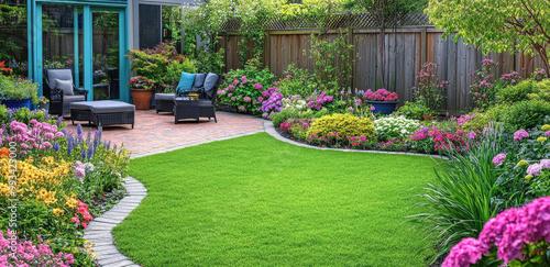 Naklejka premium A beautifully designed backyard garden with colorful flowers, green grass, and an outdoor seating area