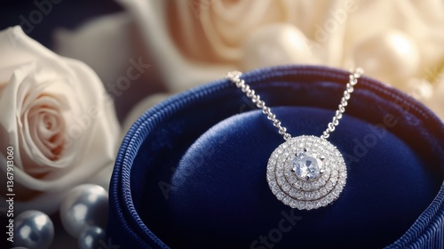 © Artittaya, Obraz premium A beautifully designed diamond necklace inside a royal blue velvet box, placed on a glossy pearl-white background