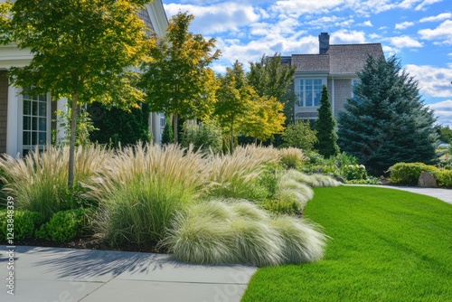 © gamespirit, Obraz premium A beautifully designed garden landscape showcases ornamental grasses and vibrant trees, all set against a bright blue sky and situated near a contemporary home