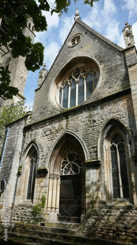 Fototapeta premium A beautifully designed gothic church stands proudly, surrounded by greenery...