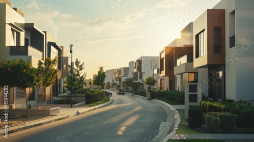 Fototapeta premium A beautifully designed suburban street lined with modern houses glows under the soft, early morning sunlight, evoking a sense of tranquility.