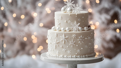 © Alona, Fototapeta premium A beautifully designed two-tier cake adorned with snowflakes and pearls, set against a festive background.