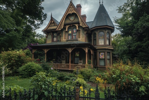 © Boinah, Fototapeta premium A beautifully designed Victorian house surrounded by lush gardens and intricate architecture.