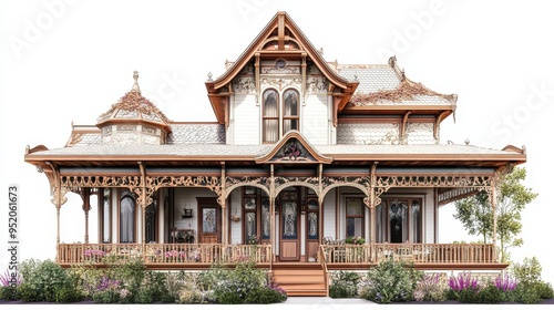 Fototapeta premium A beautifully designed Victorian-style house with intricate details and lush landscaping.