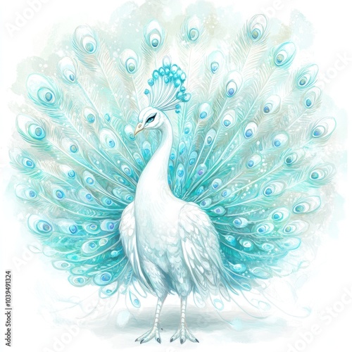 Fototapeta premium A beautifully illustrated white peacock with vibrant blue and green feathers.