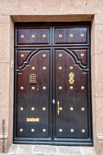 Fototapeta premium A beautifully kept old Dark wood door with brass studs