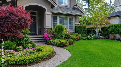 © Sonita, Fototapeta premium A beautifully landscaped front yard with a wellmaintained lawn, shrubs, and decorative plants.