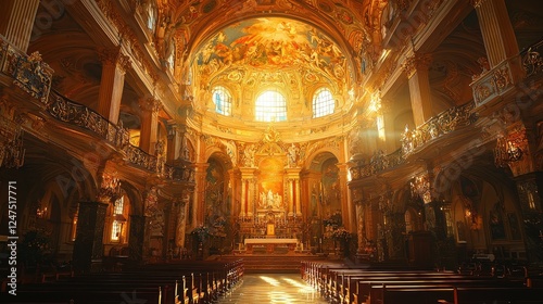 Obraz premium A beautifully lit church interior showcasing ornate architecture and decor.
