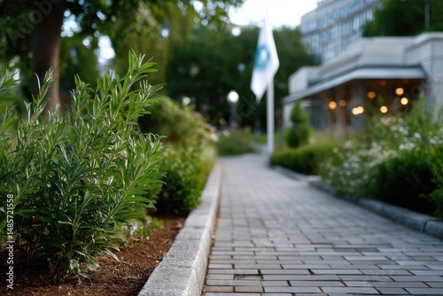 Fototapeta premium A beautifully manicured garden pathway lined with vibrant greenery, leading towards a building adorned with a flag, capturing the essence of nature in an urban setting.
