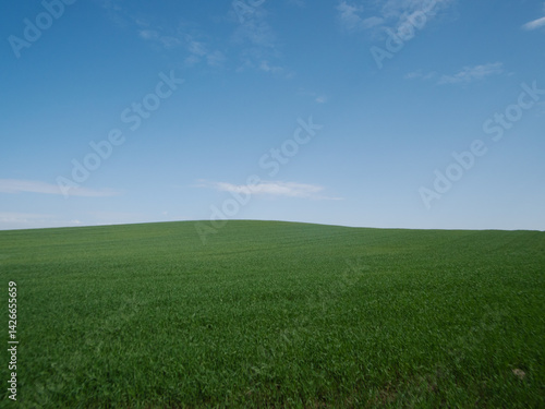 © bisonov, Naklejka premium A beautifully serene green landscape featuring a vibrant clear blue sky, perfect for various naturethemed projects