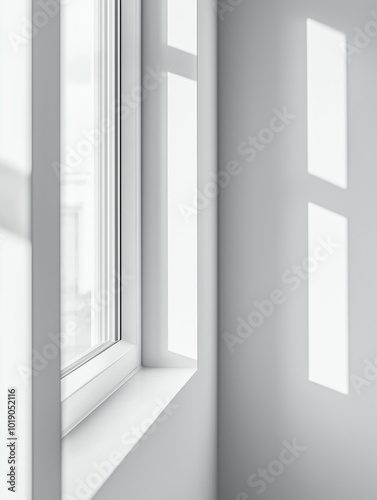© Ziart, Fototapeta premium A beautifully serene minimalist setting showcasing a potted plant on the table and soft light gracefully illuminating a white wall