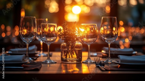 © harryaishi, Obraz premium A beautifully set dining table with glasses and flowers, illuminated by a sunset.