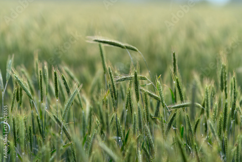© beholdereye, Naklejka premium A beautifully vibrant green wheat field stretches out under the soft, warm light of the sun