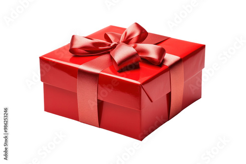 © Oratai, Obraz premium A beautifully wrapped gift box with a shiny red ribbon and bow, placed at a slight angle isolated on white background