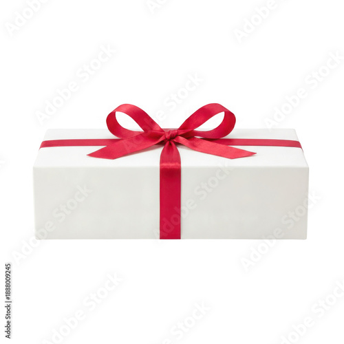Obraz premium A beautifully wrapped rectangular gift box tied with a vibrant red ribbon on transparent background