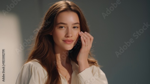 © forenna, Fototapeta premium A beauty influencer demonstrating how to cover a blemish using color-correcting concealer, blending techniques visible on a 4K camera — makeup tips, blemish concealment, and beauty education