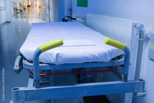 © Andrii, Naklejka premium A bed for patients in the hospital corridor. Close up.