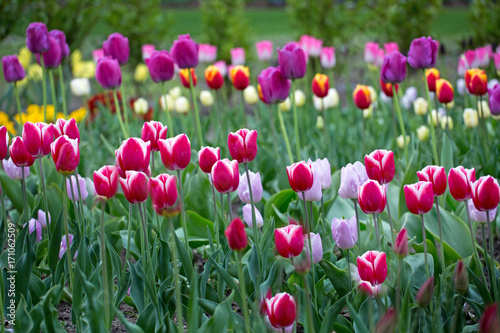 © paula, Obraz premium A bed of brightly coloured tulips in an english country garden