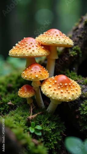 © Kingphet, Obraz premium A bed of giant mushroom caps nestled among ferns and moss, organic, lichen