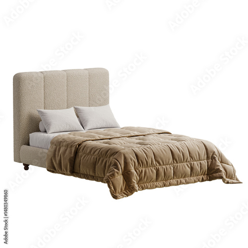 © oybekostanov, Obraz premium A bed with a brown comforter and pillows
