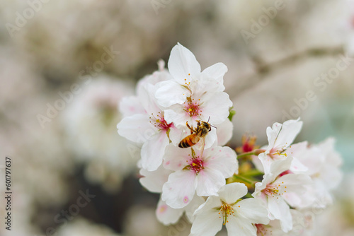© Narong, Fototapeta premium A bee and cherry blossoms are in full bloom.