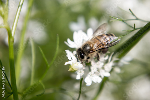 Fototapeta premium A bee collecting nectar from flower of coriander
