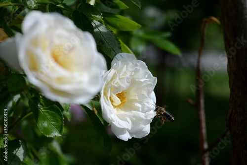 © oljasimovic, Obraz premium a bee flies towards a white rose