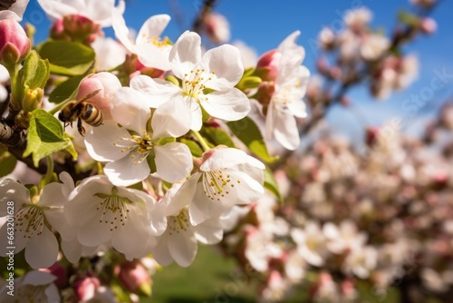 Fototapeta premium a bee gathering nectar from a flower in an orchard