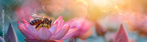 Fototapeta premium A bee gathers pollen from a pink flower in a field of soft, colorful blooms.