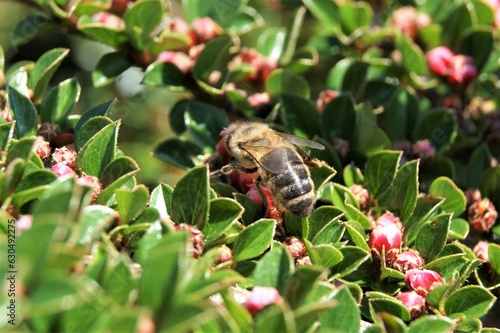 © Abarons, Obraz premium A bee on a sunny spring day. A bee on a branch of a decorative bush