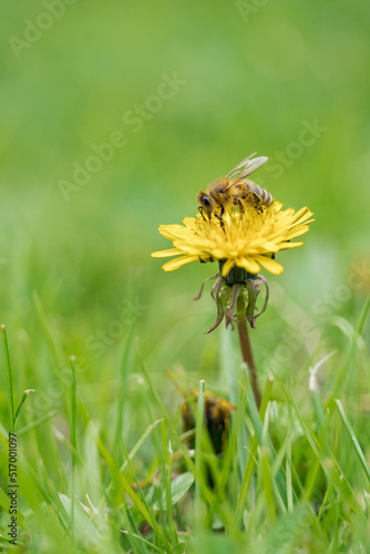 © lapis2380, Obraz premium A bee pollinating a dandelion flower.