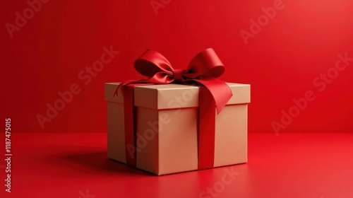 Obraz premium A beige gift box adorned with a vibrant red ribbon bow, presented against a rich red backdrop