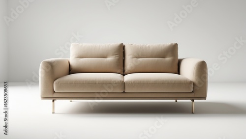 © Lasvu, Fototapeta premium A beige sofa with cushions against a plain white background.