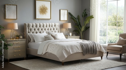 © Agus, Fototapeta premium A Beige Upholstered Bed with Tufted Headboard in a Modern Bedroom