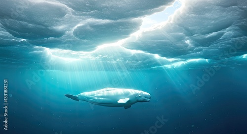© Irt, Fototapeta premium A Beluga Whale Swimming Beneath the Arctic Ice, Sunlight Filtering Through the Cracks