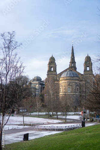 © Wirestock, Obraz premium a bench in a park in front of some large buildings