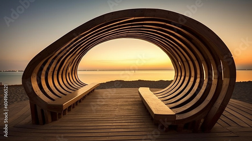 Naklejka premium A bench on a beach with the sun setting behind it