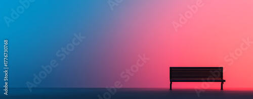 © photo for everything, Fototapeta premium A bench rests against a vibrant backdrop of blue and pink, the light creating a gradient effect. It is simple, yet eye-catching. A calming scene in a studio.