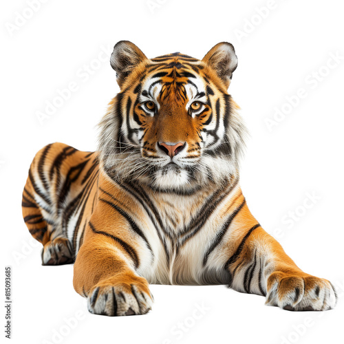 © Iftikhar alam, Naklejka premium A Bengal tiger is resting in a relaxed position on a plain white surface, a bengal tiger isolated on transparent background