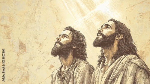 Fototapeta premium A biblical scene depicting the moment when the heavens open and a divine light shines down on Jesus as John the Baptist gazes up with awe and reverence during the baptism